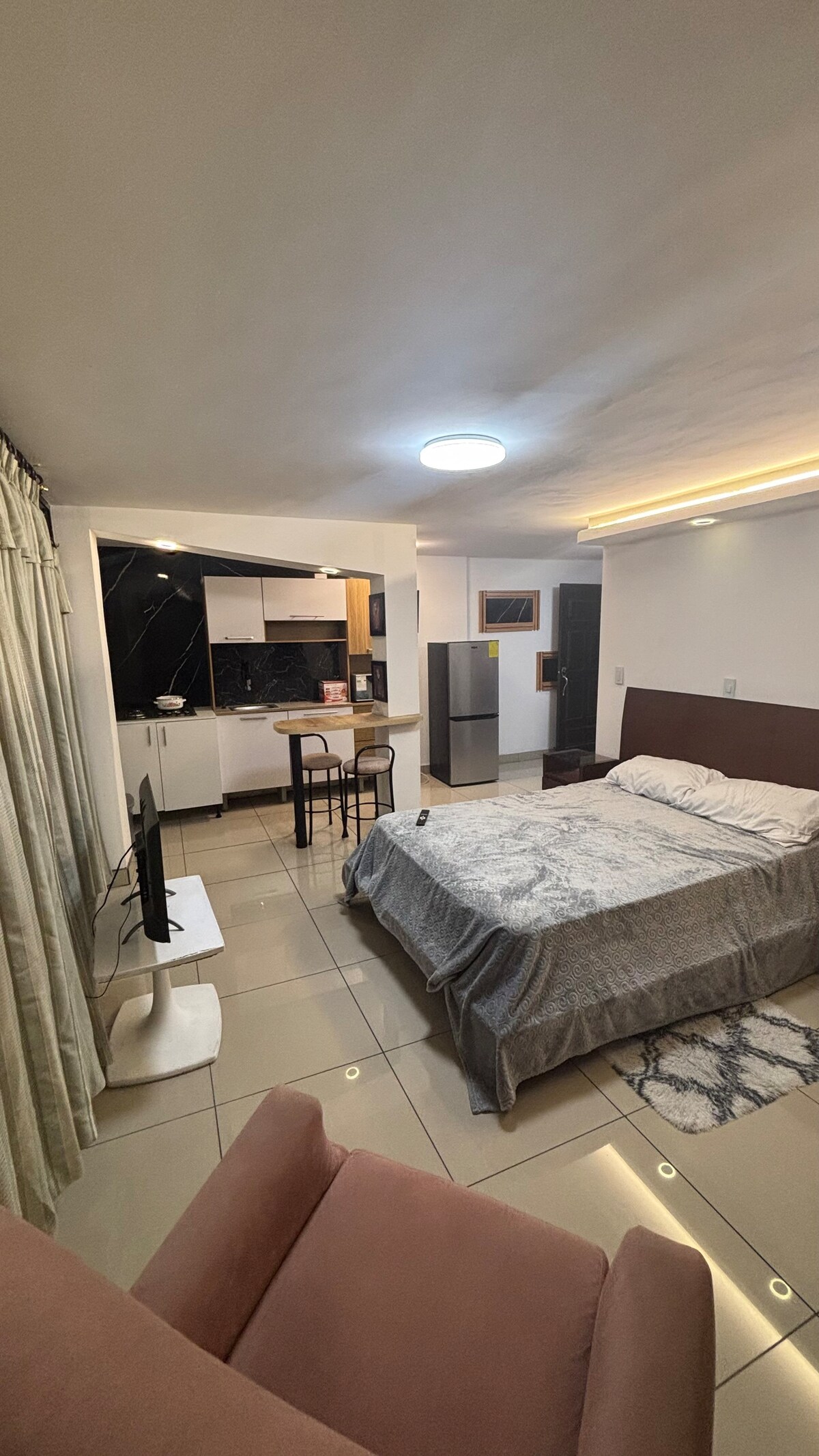 Furnished Suite. Valle de los Chillos (20 minutes from downtown Quito) Safe, comfortable, elegant place, close to multiple shops, banks, restaurants. (San Luis Shopping, ESPE) •1 double bed, 1 bunk bed. From the third guest onwards, a fee of 10 dollars is charged for each extra guest. •WiFi. •Kitchen. - 4-burner stove. - Refrigerator, Microwave. - Breakfast bar. •Desk. •TV (Netflix included). •Shower with hot water. • Balcony •Parking included.