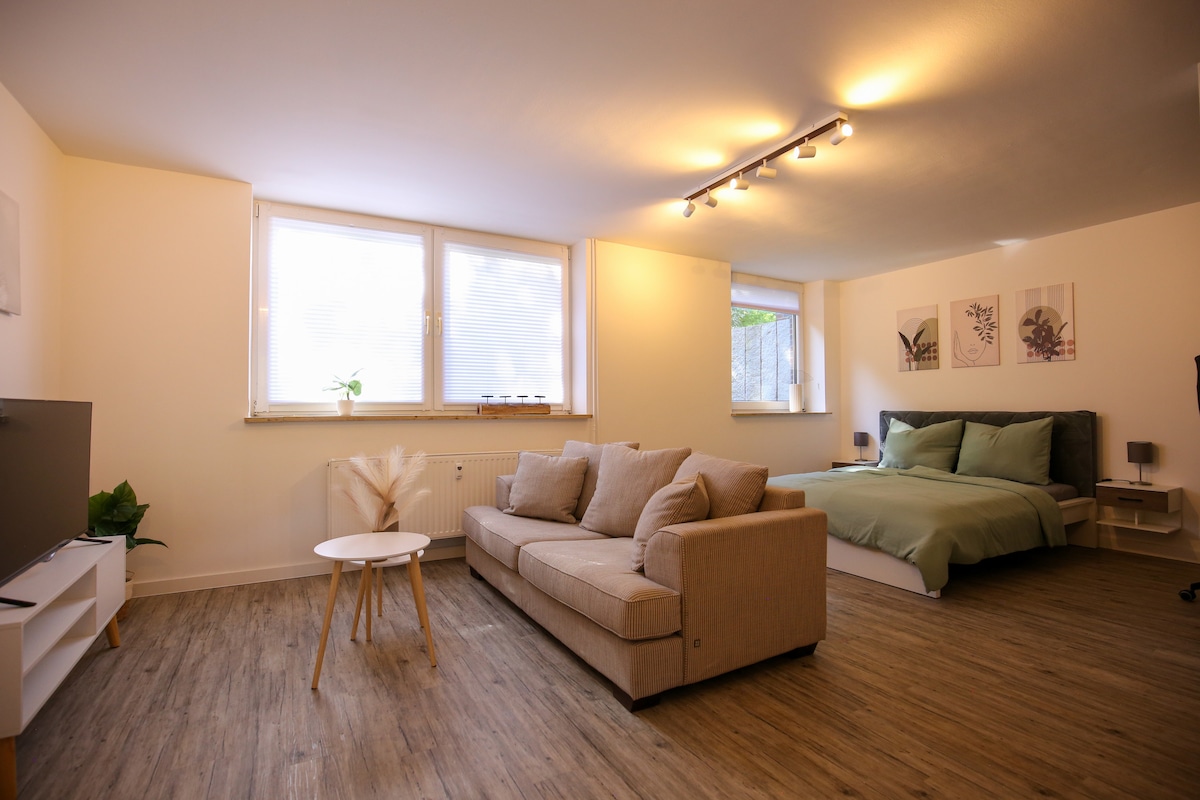 The beautiful apartment is located in the south of Hamburg. By car, you are in Hamburg in just 20 minutes. By public transport you are in Hamburg in just under 45 minutes. The apartment consists of a bedroom with a large king-size bed, a kitchen-living room with a small sofa and a shower room.