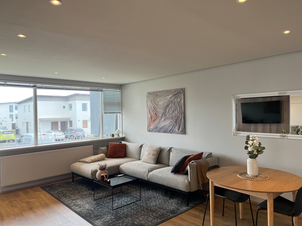 This apartment is very close to downtown and is a perfect location to explore Reykjavík and surrounding areas. The apartment is 52,8 sqm, there is one bedroom with a kingsize bed and in the living area is a cozy sleeping sofa that acomodates two adults. The apartment is on the top floor and has a balcony with a view over the ocean.