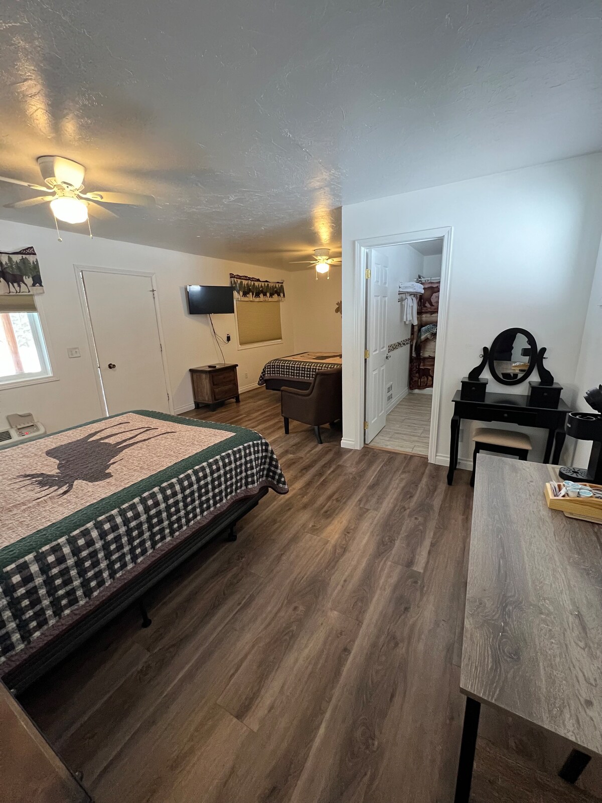 This secluded 450 sq ft studio loft with deck overlooks the pristine Selway River, amidst cedar trees and ferns. The ever-present 24/7 river noise can either charge your senses, or lull you to sleep. This setting is ideal for active adventurers who raft, hike, swim, fish or bike, as well as for the sedentary types, seeking tranquility in paradise. The unit features a king-sized bed with full river view, queen sleeper-sofa, shower, and a deck for lounging and outdoor food preparation.