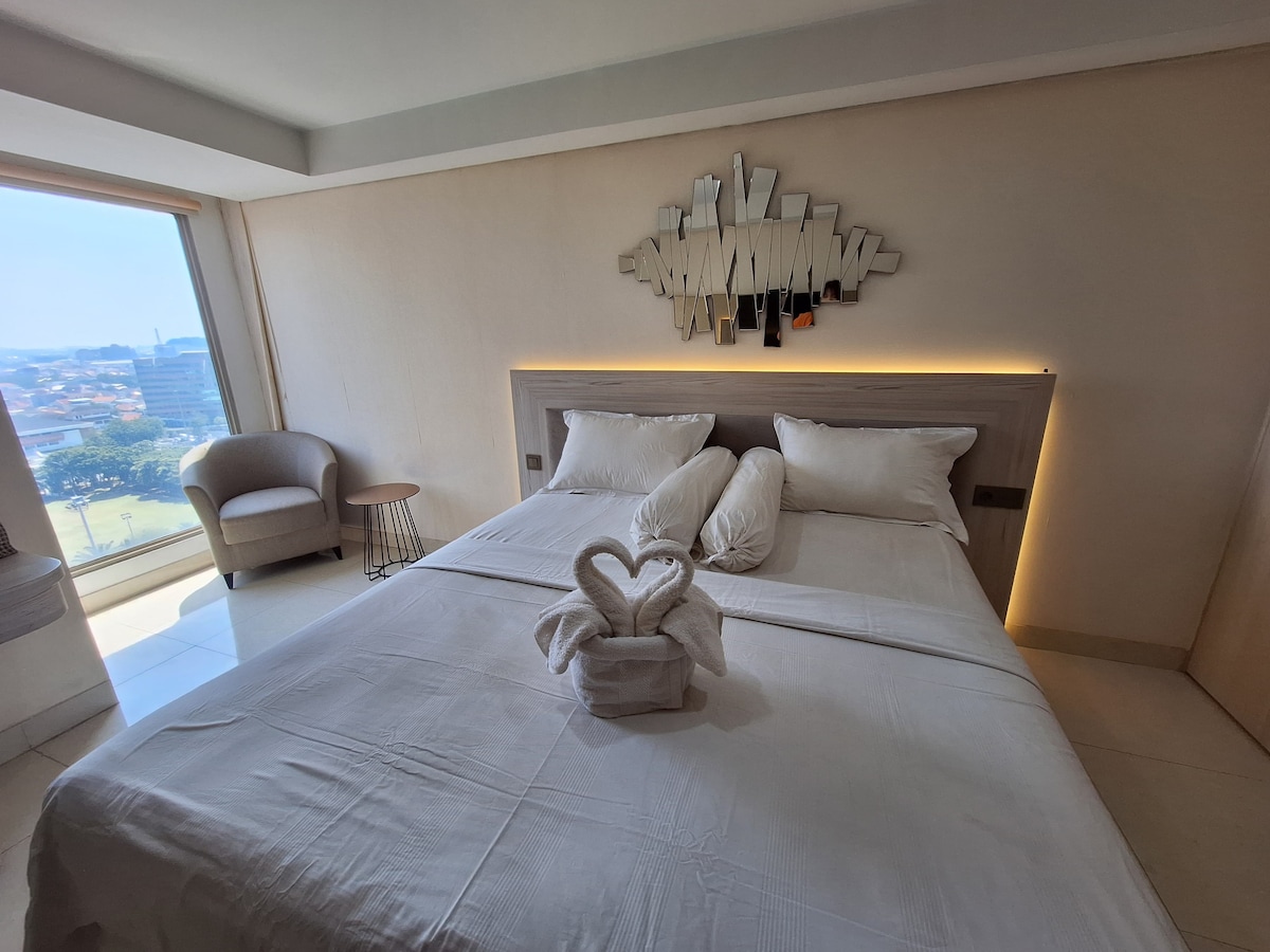 A cozy 1 bed room apartment, with 2 bed, in the heart of the city, closed to Diponegoro University, and several university near by. Has good natural lighting from large windows and balcony. Complete with an en-suite kitchen and many cabinets for storage. Brand new smart TV for Netflix, YouTube and Disney plus. he property has an amazing infinity 2 swiming pool and gym on the 5th floor. with amazing views.