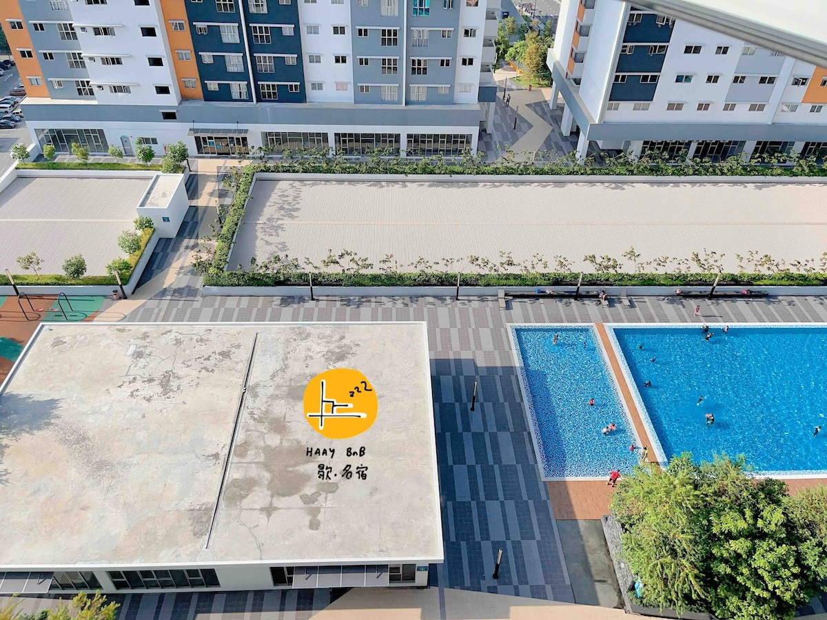Explore our cozy studio, which can accommodate 2 to 3 people with a queen bed and a sofa bed. Only a 15-minute drive from KLIA T1/T2, the place is surrounded by many restaurants, fast food branches, groceries, and laundry shops, all within walking distance. Savor all the amenities, including the kids’ playground, BBQ area, gym, and swimming pool, with 24/7 security. * Unavailable drop your luggage before check in hours.Due to building designed, need to walk 10 steps staircase to get elevator.