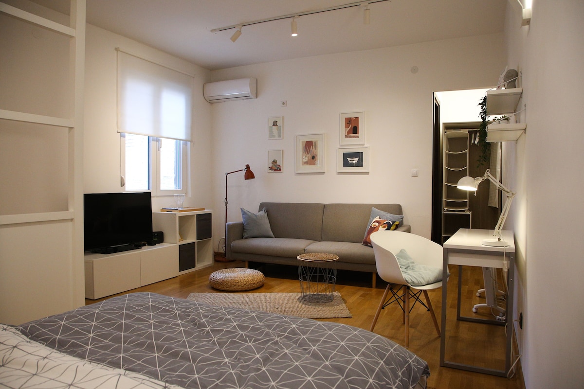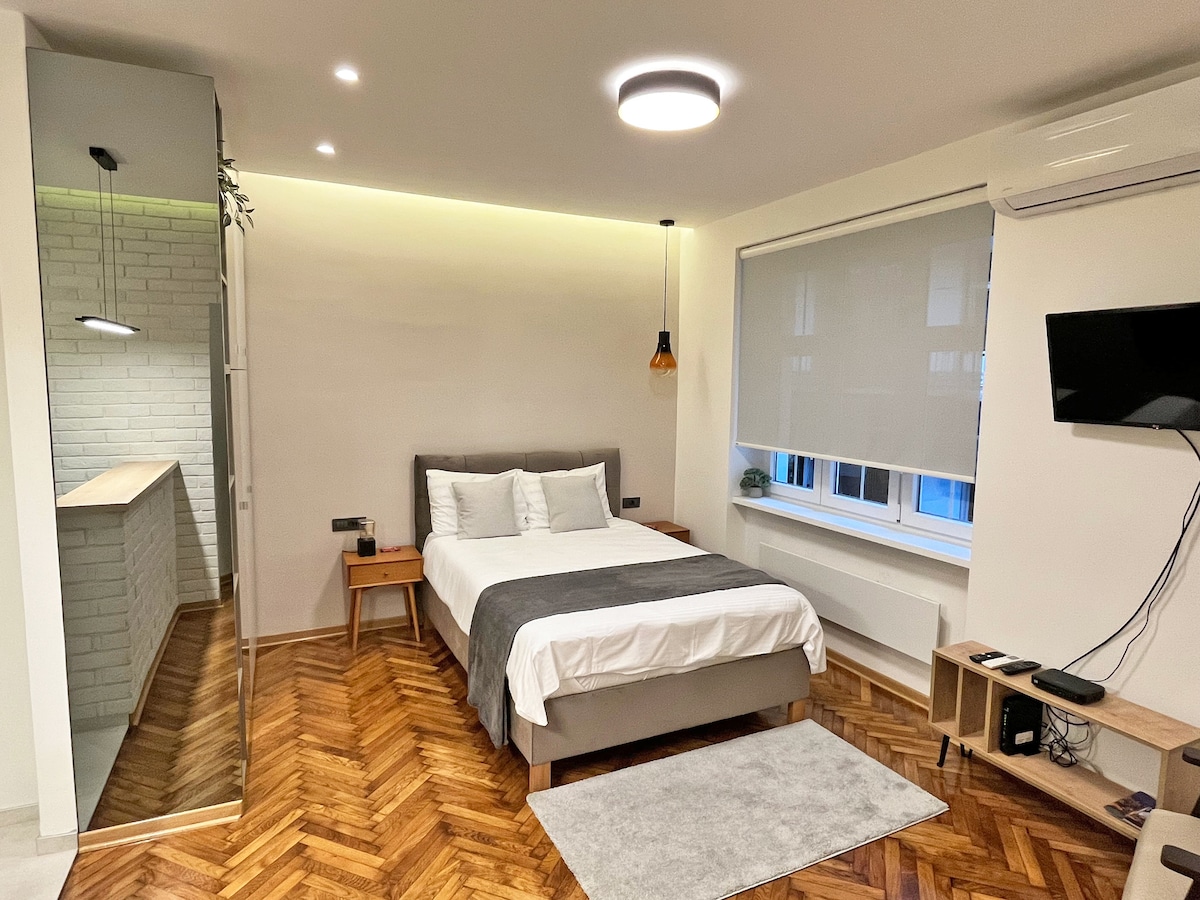 Skladan, moderan i lepo dizajniran studio za dvoje, okruzen svim gradskim desavanjima, a ipak pozicioniran na mirnoj lokaciji. Prostor je jedinstvena celina i sastoji se od dnevne sobe, kuhinje odvojene barskim stolom, radnim prostorm, predsobljem sa komfornim ormarom i kupatilom. Francuski balkon pruza lep i sirok pogled kao i dobru osvetljenost. Studio je u potpunosti renoviran, a namestaj je nov i moderan. Ovaj smestaj ce vam dati udobnost kakvu zasluzujete.