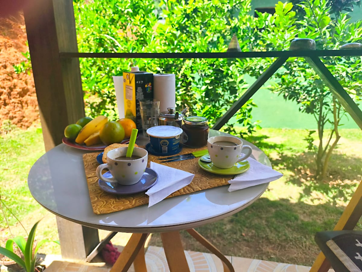 🌿 Silence, greenery and pure relaxation. What you'll find in the Suite: 📺 Smart TV 🗣️ Alexa 📶 Wi-Fi 💻 Work space 🛏️ Bedding 🛁 Bath towels ☕ Complimentary breakfast: coffee, milk, toast, jam, butter and sugar 🔥 Barbecue available 🧘 Reiki: Available by appointment and charged separately Attention: 🚪 Independent entrance with access from the host's balcony. 🐶🐱 Puppies and kittens present 🌳 Forest area: local animals may appear