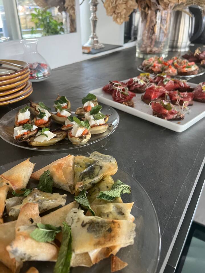 Mini eggplant confit stuffed with olive caviar and buffalo mozzarella