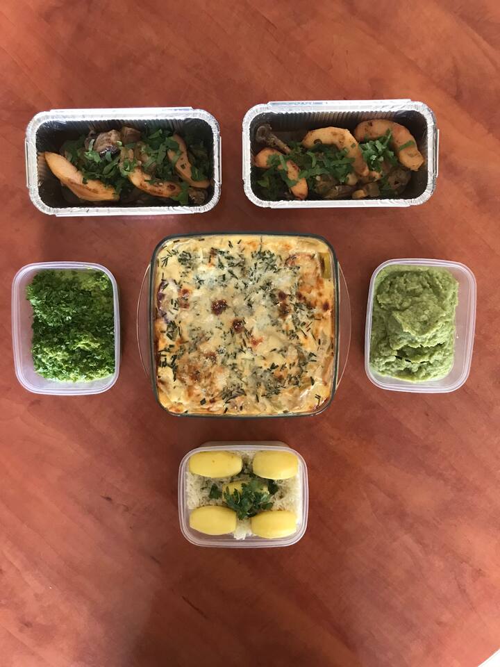 The dishes are packed in single-use trays and ready to be reheated in the microwave in 3/4 minutes