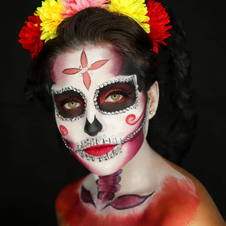 Embrace tradition and prepare for the Day of the Dead festival with a vibrant, intricate look, created in the comfort of home.