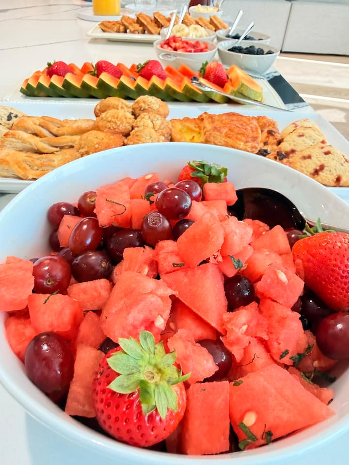 Ease into the day with a chef-prepared breakfast spread—eggs made to order, a hearty breakfast patata with spinach, potatoes, and feta, plus deluxe pancakes or waffles—along with a full tea and coffee station. Then roll right into a late lunch with soup and sandwiches served poolside for a relaxed double service.
