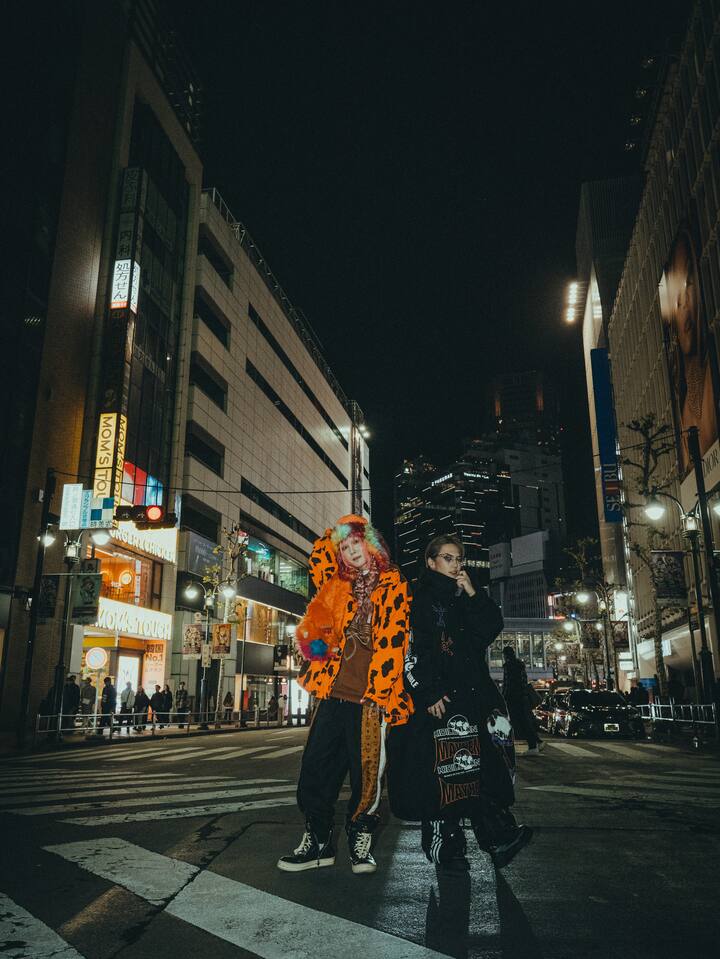 The neon lights, reflections, and city atmosphere create dramatic portraits inspired by Japanese street photography.