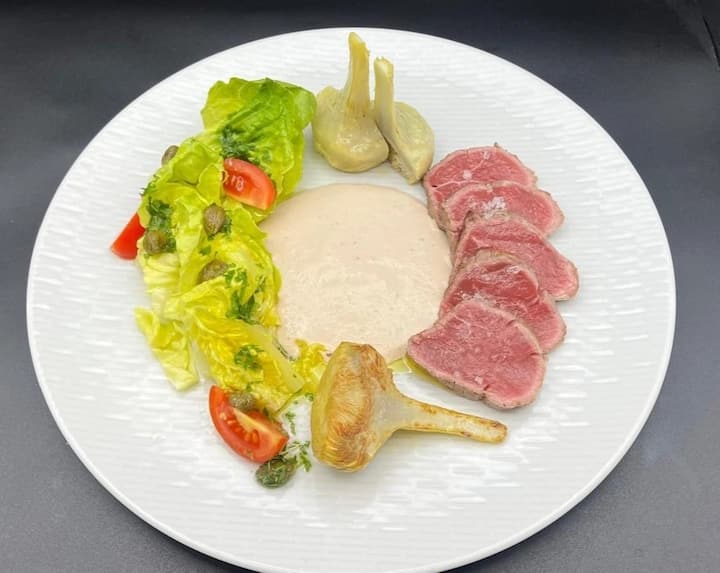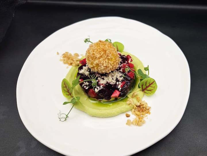 Enjoy a balanced menu with a fresh salmon tartare, followed by a delicate low-temperature egg with truffled parmentier. The main course offers a tender veal cheek in red wine, and to finish, a creamy cheesecake with red berry coulis.