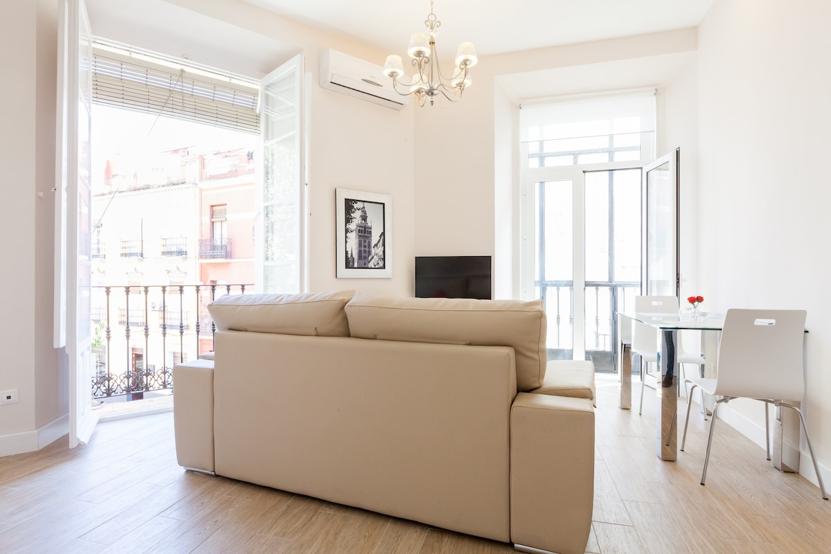 A beautiful and bright apartment, located in a traditional neighborhood and full of vibrant social life - El Arenal. Only 250 meters from the Cathedral and Bullring (Maps). It has a living room with 2 balconies facing the street, a quiet interior bedroom with a 1.8x2 meter bed, a bathroom with a shower, and a full kitchen with all the utensils. Sheets and towels are always included.