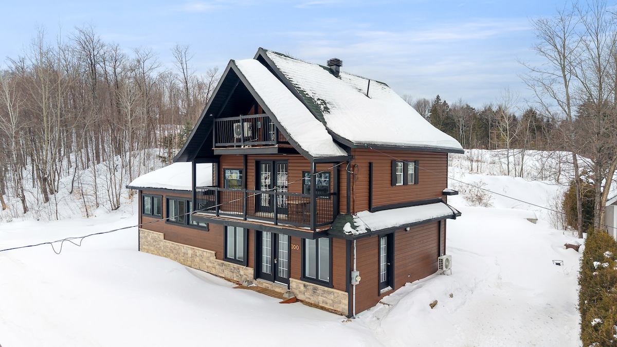 "Chalet Le Boisé" 1 hour from Montreal! Small chalet nestled in a wooded area, for 4-6 people. Experience the cocooning spirit with spa, clawfoot tub and indoor/outdoor fireplaces. Stunning views of the lake. High-speed wifi connection to combine work and relaxation. Perfect for families, couples and teleworkers looking for an escape. Your haven of peace awaits you! Note: Lake view, no lake access. Please respect the neighborhood 🙂