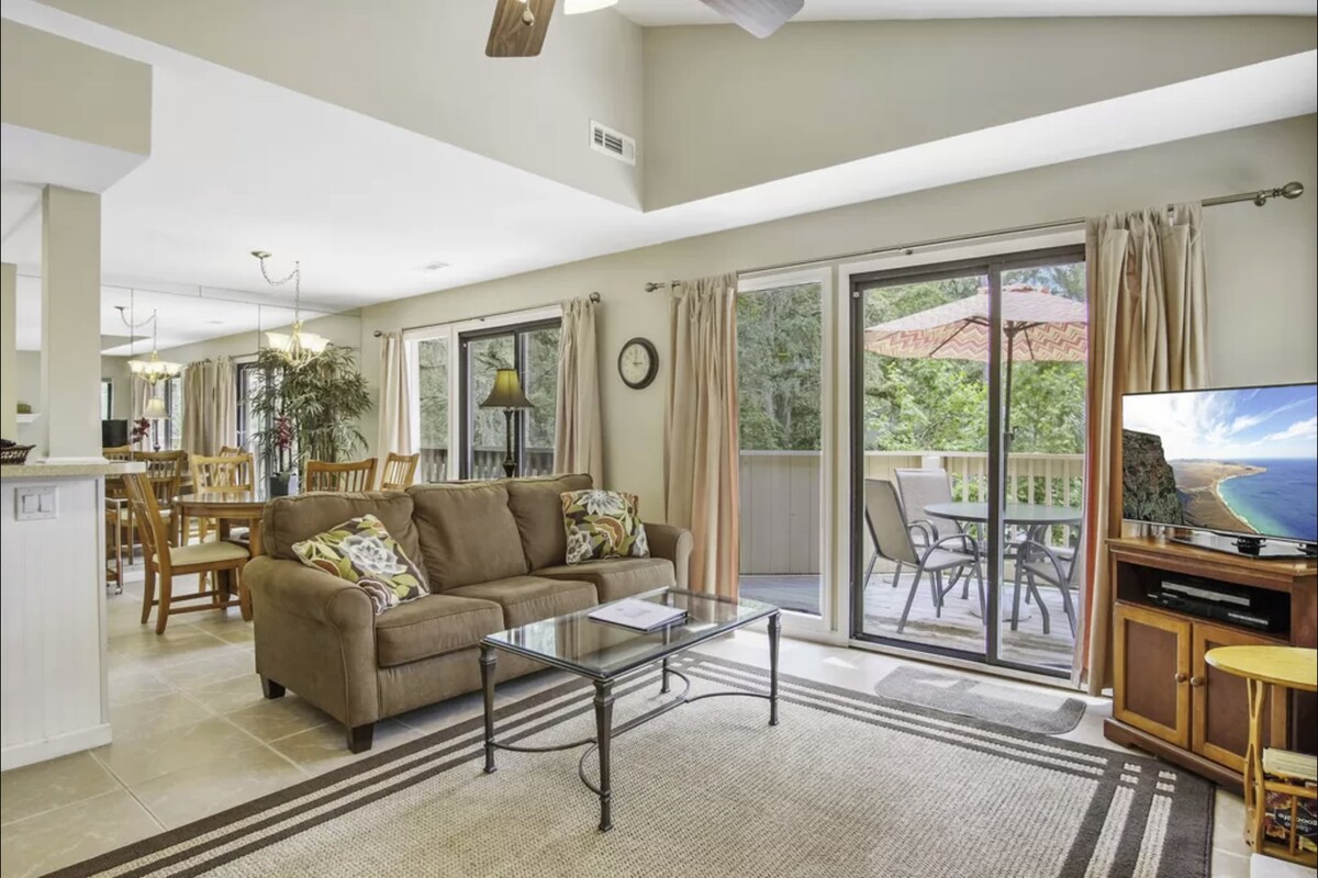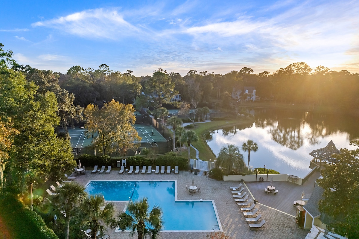 ✨Top 10% Guest Favorite✨ Gated Beachfront Resort: Golf, Tennis, Pickleball, Pool, Restaurants & Bars! Gorgeous Sunny Villa w/Panoramic Lagoon & Golf View! Beautiful & Lush Scenery: Huge Old Oaks, dripping in Spanish Moss ●Stylish Coastal Décor ●Sunny 1st Floor ●KING BED Master ●3 XL SmartTVs ●FREE WIFI ●Fully Stocked Kitchen ●Walk-in Shower ●Washer/Dryer ●Beach Chairs, Boogie Boards & More! ● BBQ ●Keyless ●Gorgeous Walk & Bike Paths ●Close to Coligny! ●Walk to Shipyard Golf Club & Pub!!