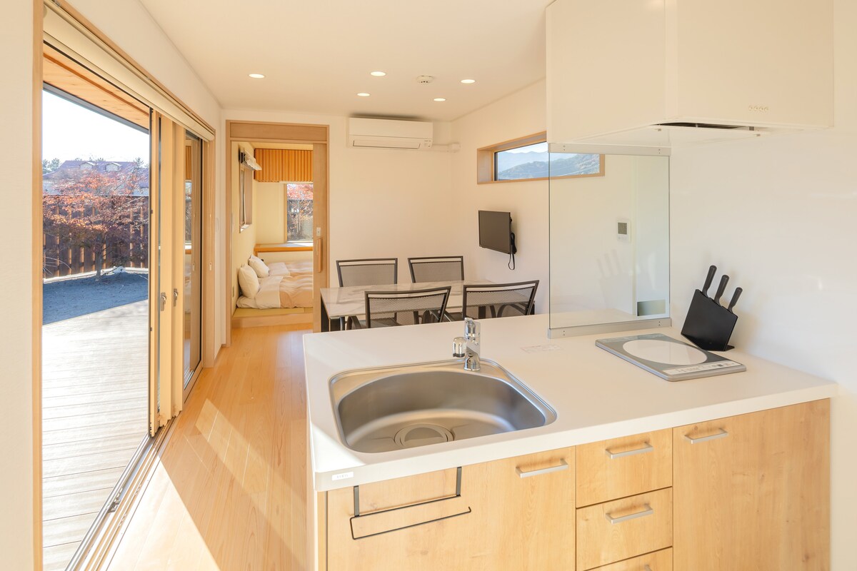 In the mood Cottage LUX01 | Located in Fuji-Hakone National Park, where nature is abundant, at an altitude of 1,000 m, and a 3-minute walk from the shore of Lake Yamanaka. * Please refer to the "In the mood Yamanakako" website for more details on the facility, as well as deals and plans. The building was completed in September 2021 after renovating a log house built in 1979. A private cottage with a stylish, modern design where you can enjoy a BBQ, campfire, and sauna under a stretch tent while enjoying the dramatic views of Mt. Fuji. The terrace, which continues from the living and dining room, has a permanent stretch tent. The open kitchen across the bar counter creates an open space. 90 minutes by car from Tokyo, 5 minutes by car from Lake Yamanaka Interchange, 20 minutes by car from Gotemba Interchange. It is also a good access to the sightseeing spots of Fuji Goko, so it is recommended for family trips and workations. Enjoy an elegant time in a top-ranked cottage. ※ We use a room charge system. ※ There is a separate fee for using the BBQ equipment/fire pit/sauna.