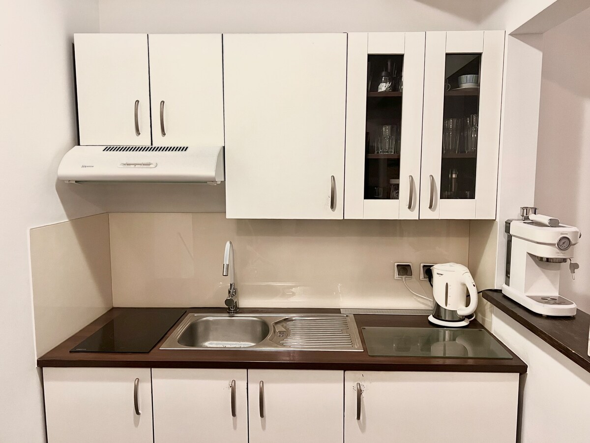 The apartment is spacious, decorated in bright, cozy tones, reminiscent of the seaside climate. There is a well-equipped kitchenette, perfect for preparing meals, a seating area and a balcony where you can drink your morning coffee while admiring the surroundings. In addition, the property has amenities such as a parking space and free Wi-Fi, which make the stay comfortable for both families with children and couples looking for a romantic getaway.