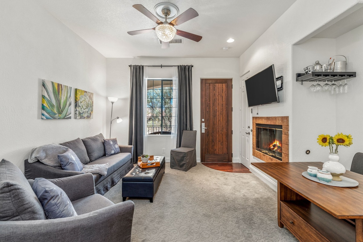 Welcome to this private, newly renovated condo. The living room has plenty of cozy seating, a gas fireplace, and a smart TV. Enjoy a cup of coffee or cook your favorite meal in the full kitchen. The bedroom boasts a California King bed richly appointed for your comfort. Enjoy the outdoors on your private patio, cool off in one of several pools in the complex, or take in the sunset views from the jacuzzi. The property is a short walk to Old Town. *Wheelchair friendly. Contact us for details.