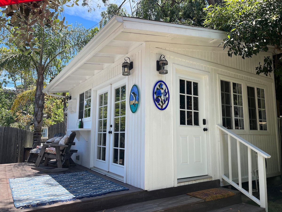 Staying in The pearl feels like sleeping in your imaginary treehouse under the canopy of pepper trees- Charming and peaceful . Completely private with your own personal views of Big Rock peeking through the trees above your outdoor gated and private balcony. Wanna wake up to the sound of frogs from the nearby creek or feel like tuning in to the birds chirping above you ? Dash to town for a hot cup of java and an artsy conversation ? Perhaps a morning swim at the beach , or simply rest at ease .