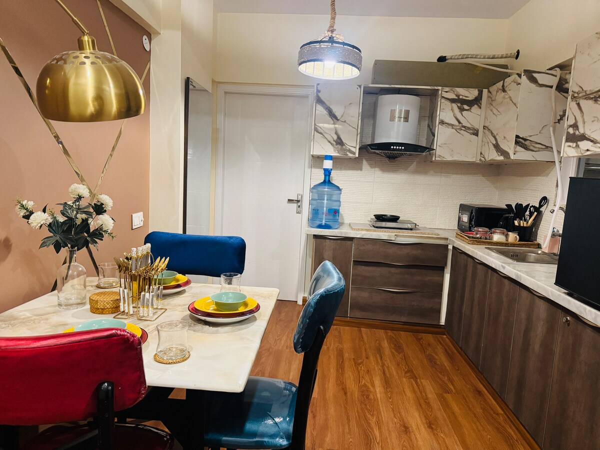 Enjoy this bright, colorful studio in a new building of DHA Phase VI (Small Bukhari) at 2nd floor (without lift). Watch Netflix & YouTube on the smart projector in bed 🎥, or enjoy movies with the LED in the living room 📺. Chill on the velvet sofa 💺, cook in the modern kitchen 🍳, and dine under the arc lamp beside a lovely painting 🎨. Two bathrooms 🚿 mean no waiting. Modern, stylish, and super comfy ✨