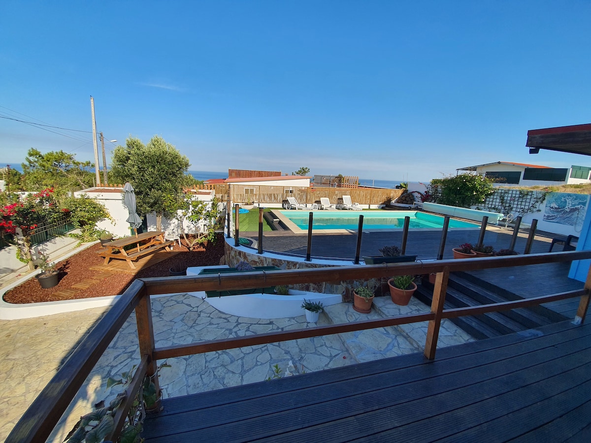 'Maresia' - You can smell, hear, see, feel and taste the sea in this lovingly created home overlooking the Ocean. Beautiful raised blue wooden chalet, Scandinavian style, comfortably furnished, with balcony, decking, barbeque and swimming pool within walled garden. Views of the sea and sunset. Stunning location near clifftop, in very peaceful, scenic area. Coastal walks, wildlife, pinewoods. Access to clean sandy beaches at Sao Juliao, surfer's paradise. Nearby local shops and dining.