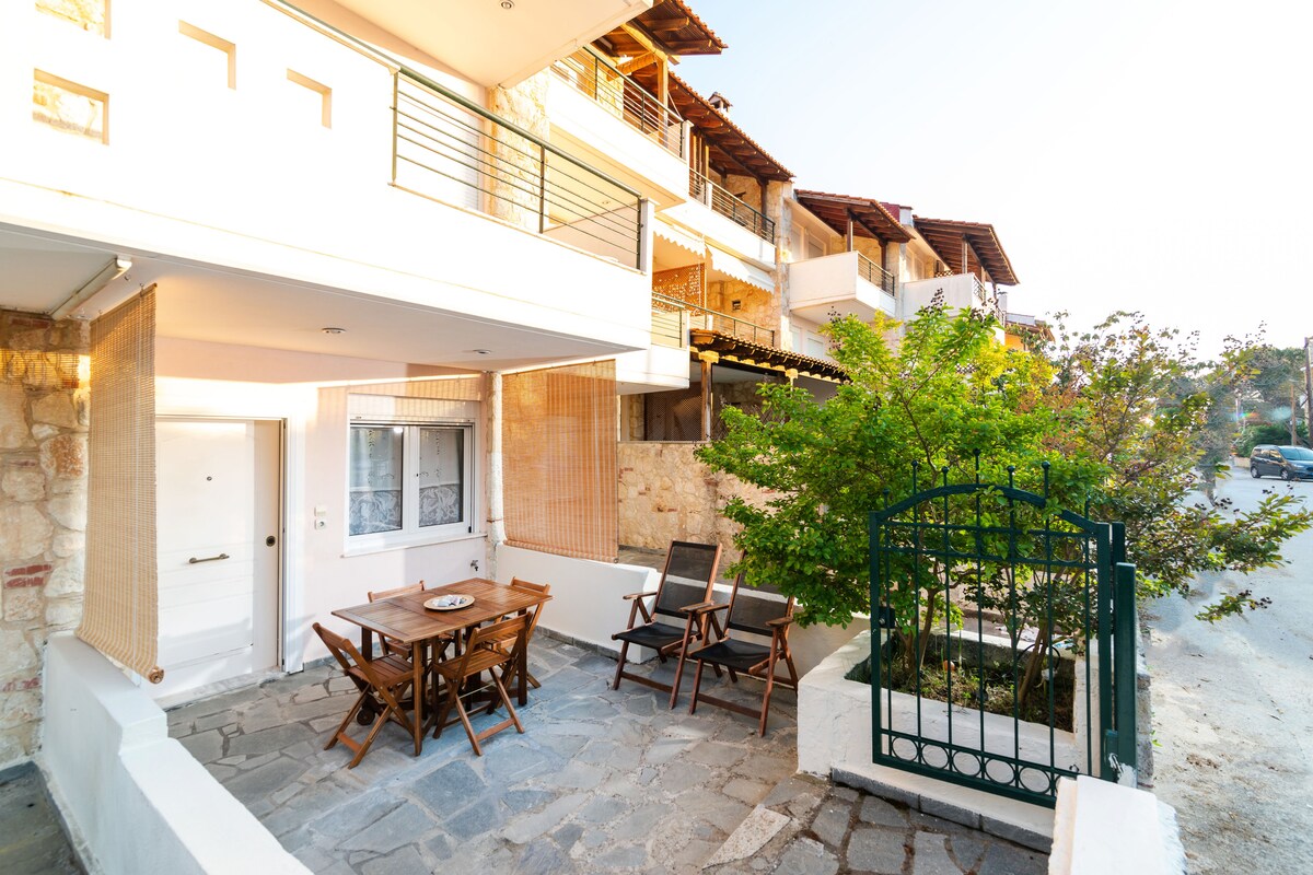 30 metres from the beach (90 feet) , at Pliades estate in Siviri. Cozy and bright house with a SMART TV & Wi-Fi big refrigerator washing machine microwave stove and oven air conditioning included! Suitable for maximum 4 people, families etc. On the first floor of a complex. Right up to the sea with a good breeze at night! 25km from Sani Beach and just 10km from Kallithea and 15km from Afytos.