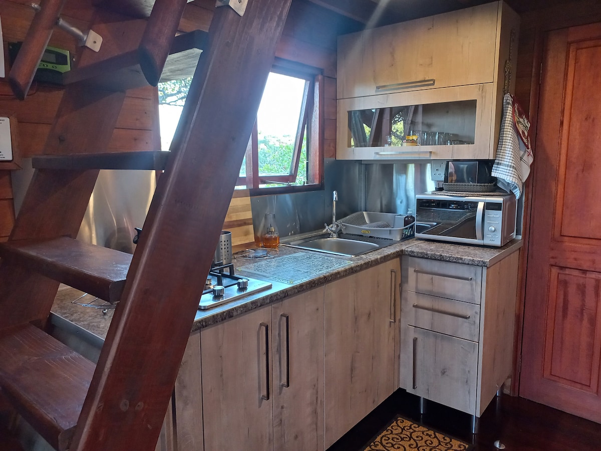 Two Trees is a self catering, tiny house, tree house. An elevated wooden house nestled between the trees with a spectacular view from high above! Here you can enjoy the outdoors from the comfort of the deck. Enjoy a braai/barbeque while taking in the beautiful view over the bush. The inside is cosy, equipped with everything you will need to be comfortable with a modern feel. Downstairs is the open plan living area, kitchen and bathroom. This opens out onto the spacious deck!