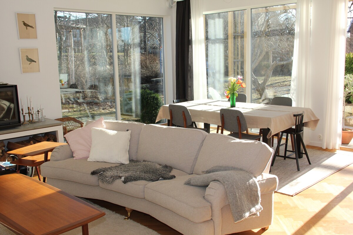 A property with a fantastic location by the sea only 10 meters from the water. Overlooking the Stockholm inlet, you can see boats and ships passing outside the house, which has a terrace towards the sea. The cottage is only 12 km from central Stockholm and is separate from the main building where we live. Nature reserves for walking and running are a stone's throw from the cottage. The wood-fired hot tub that is on our jetty can be rented for an evening. There is a possibility to rent sea kayaks (2).