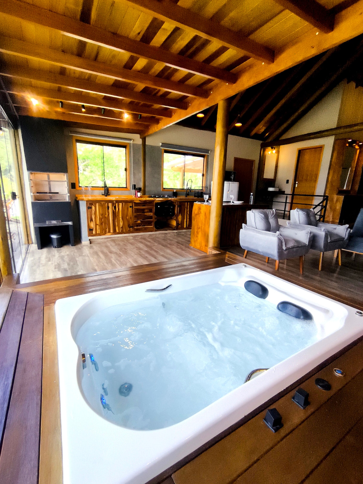 Romantic retreat in the Serra with incredible mountain views! Enjoy the sunset in the outdoor heated jacuzzi, to the sound of a waterfall. Exclusive, cozy and complete chalet, ideal for couples seeking rest, privacy and connection with nature. Close to the Rio do Peixe Tourist Corridor and adventure sports. Experience unforgettable moments at Mirante do Rio Chalet!