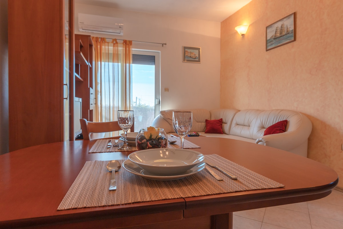 The modernly furnished apartment has a room with a separate air conditioning, TV and modern lighting. The kitchen is equipped with dishwasher, ceramic plate, microwave and all the equipment. The living room has sofas for a third person and its tv and air conditioning. The apartment has a beautiful terrace overlooking the sea, ancient Salon and Split. Guests can use our swimming pool and barbecue in the garden.