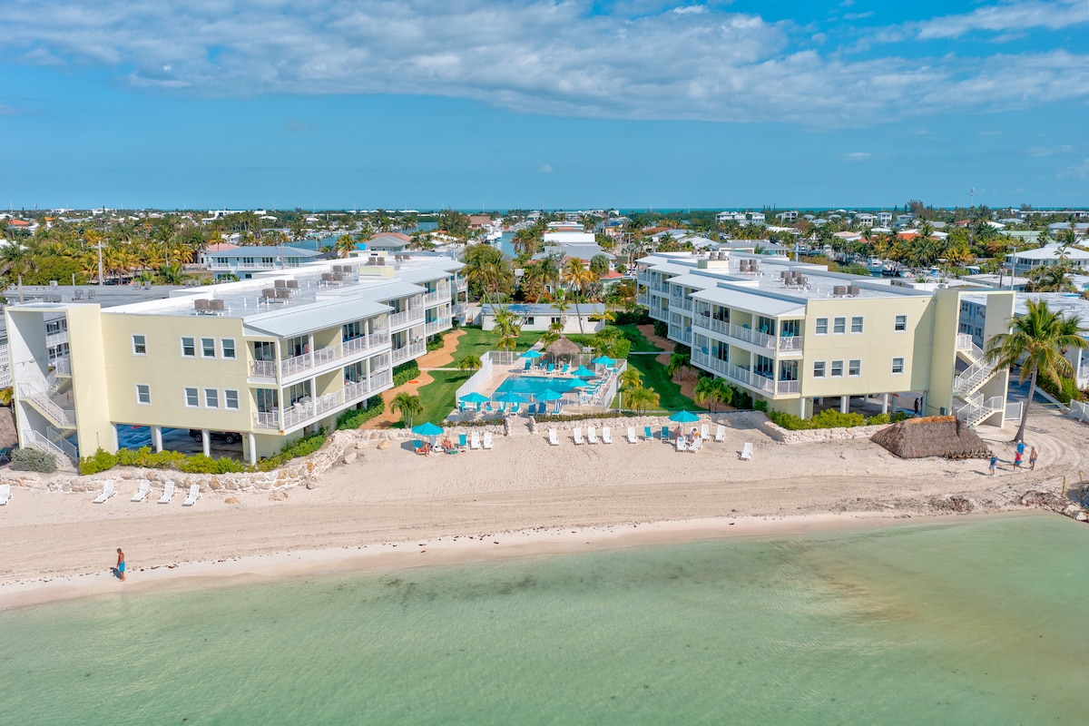 Experience a wonderful ocean view from our beachfront condo in Key Colony Beach. Newly renovated studio condo in Key Colony Beach, Florida Keys. Unit #10 offers one king bed, a fully equipped kitchen with full-size appliances and essentials, reliable WiFi, and a SmartTV for a comfortable stay. Enjoy the heated pool and private sandy beach just steps away. Sunset Park is next door-perfect for catching a beautiful Florida Keys sunset.