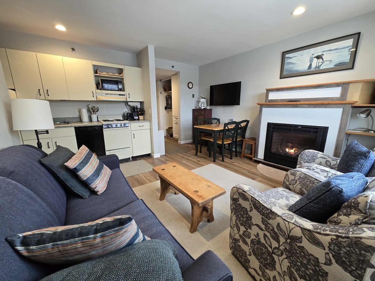 Renovated condo perfect for couples or small families, comfortably sleeping four. Enjoy activities like skiing, snowmobiling, hiking, fishing, or relaxing. The condo features a cozy queen bed and all essentials for your stay. Located 8.8 miles (<15 minutes) from Sugarloaf Mountain, it’s on the snowmobile trailhead and Maine Huts and Trails system. A serene river behind the condo offers a peaceful retreat, and it’s just steps away from a restaurant/bar for dining and drinks after your adventures.