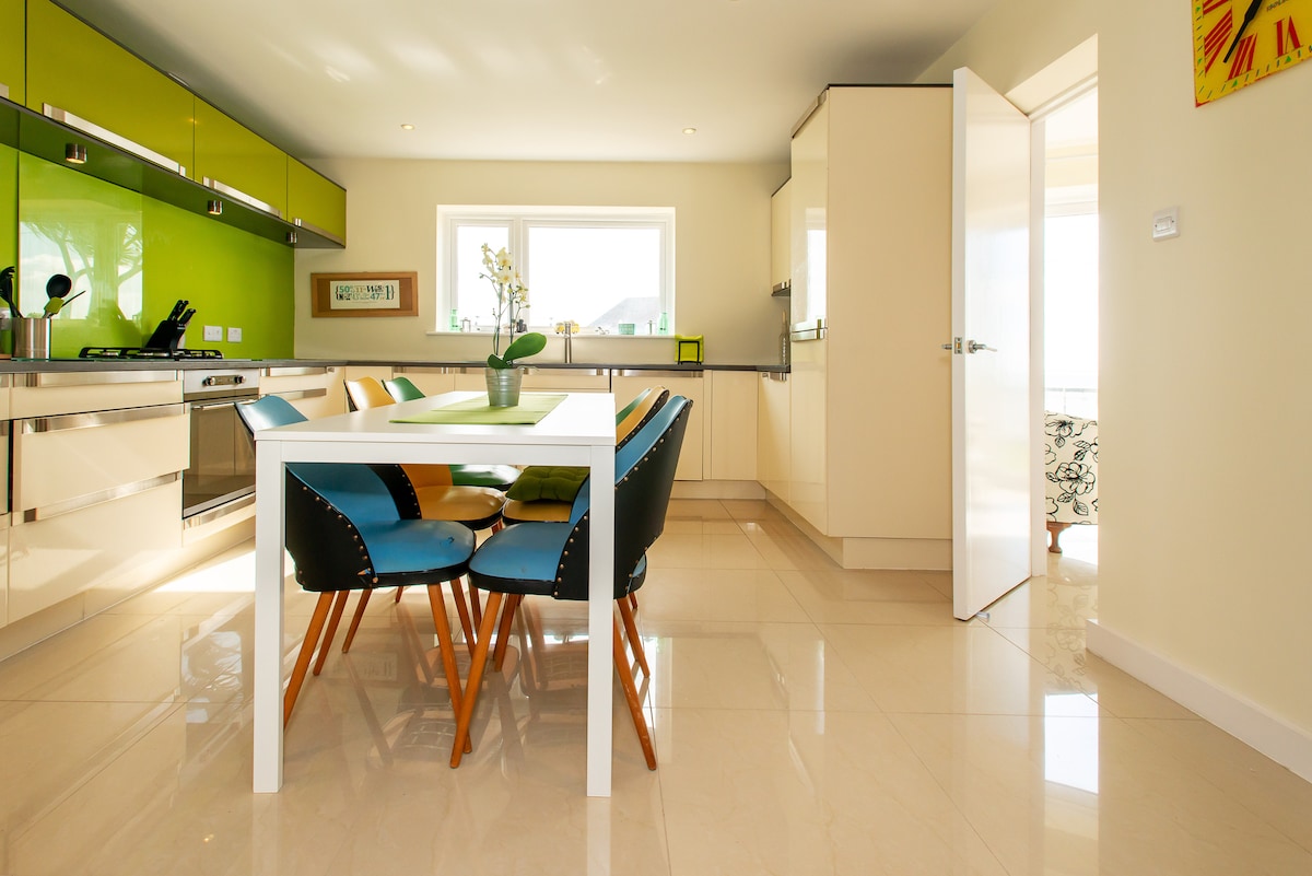Enjoy your perfect getaway in this award winning 2 bed penthouse apartment with 180 degree sea views in the heart of the tranquil Alum Chine area of Bournemouth just a few minutes walk from the beach. The property boasts two dining areas, one of which sits on the large balcony with views across Bournemouth beach and a bespoke wood burning stove for the winter nights. The open plan kitchen leads onto a cozy living room where you can enjoy Sky Glass TV entertainment through super fast WiFi.