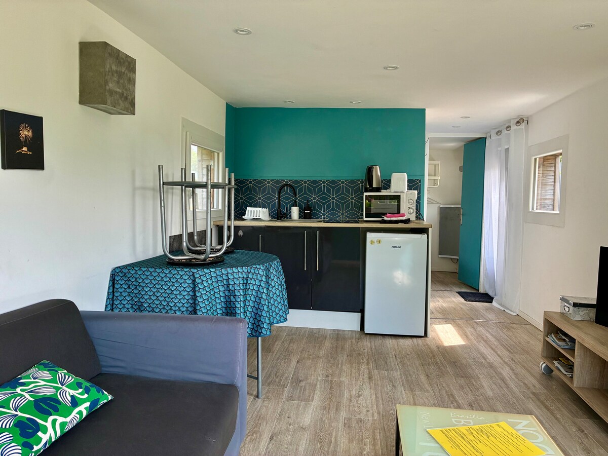 Beautiful small villa of 53 square meters, with 2 bedrooms, one bathroom and open kitchen. Enjoy the paradisiacal views of the garden, the 25 square meter private terrace with pergola and shade sail, and the singing of cicadas, birds and sometimes the pond frog! The house is independent from the Mas, without any vis-à-vis. Large parking New and functional layout. Tranquility and serenity guaranteed:) ! Access road not suitable for motorhomes!