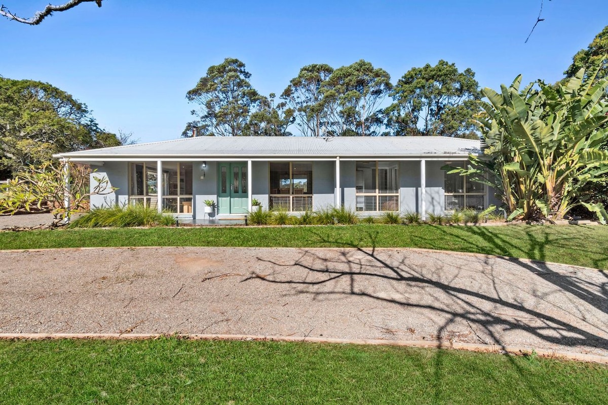 Welcome to our peaceful, spacious, art filled home: a real country escape. We live here full time and only Airbnb it when we are away. We hope you love it as much as we do. Wake to birdsong, meet our famous mini donks, stargaze by the firepit, relax on the veranda or in front of the log fires, bathe "'al fresco" or have long, lazy meals. An easy 10-minute walk to Bundy's cafes and shops, 1 km to the waterfalls and walking tracks of Morton National Park, and don't miss the local wineries!