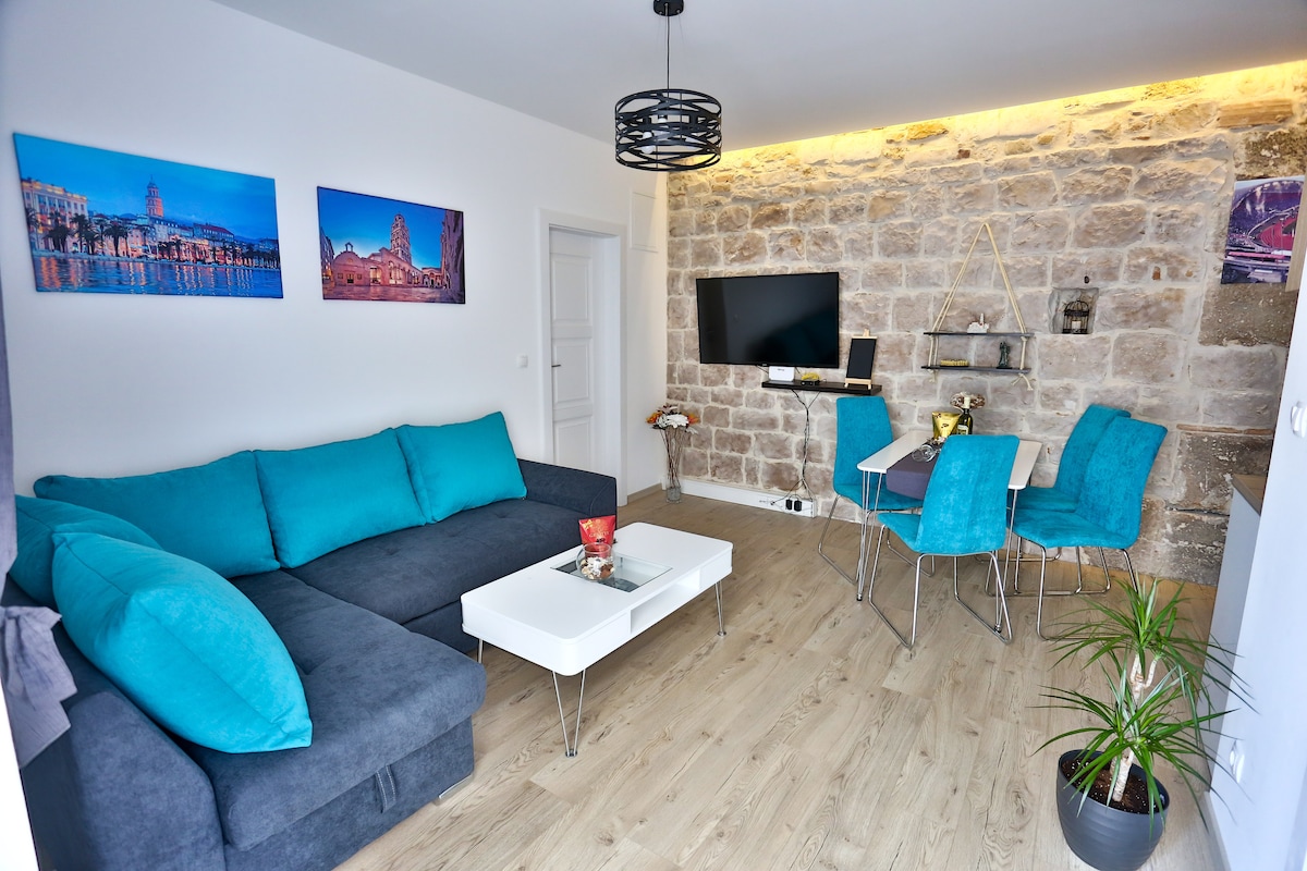 Apartment on the second floor of a newly renovated 600 year old house. It is located 200 meters from the Golden gate (main entrance of the ancient Roman palace). You can take a 15 minute walk to the nearest beache or you could also take a bus. The famouse park-forest Marjan is also near by. There is more than enough restaurants and bars not even a minute or two away! If you are looking for good time, or some peace and quiet, here You will definitely find both!