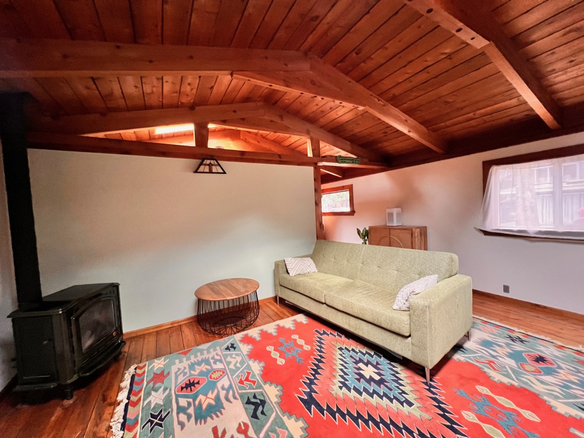 Gorgeous secluded guesthouse with tons of wood features. Reclaimed barn wood on walls, trim and kitchen cabinets. This hidden gem very private if you would like to be off the beaten path for a couple days. We are located a 7 minute drive down the Meadows from the town of Pemberton, situated along the meandering Ryan River. Our property has 5 acres of manicured lawns, huge cedar trees, and trails all around for you to explore. Please be advised that we live on an active logging road.
