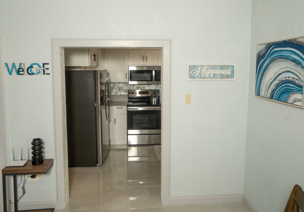 Trendy 2 bedroom, 1 bathroom apartment attached to our house in gated community. Has separate entrance with keypad entry and kitchen area, in a residential neighborhood, 5 minute walk to a beach. Being a family ourselves we understand it might be easier to stay at a comforttable home vs hotel, but also potential for noise as our neighbors are building. Our amazing Angela is available to answer questions and offer tips on local shopping, activities, beaches etc.