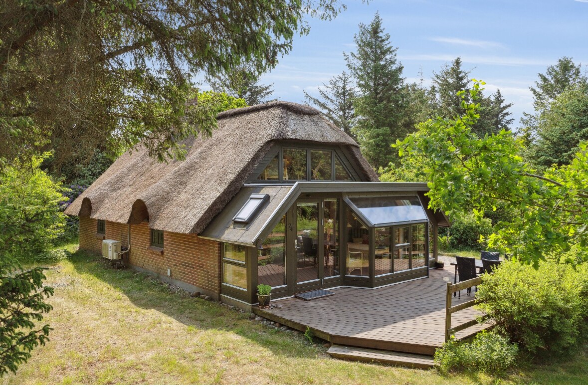 Dette skønne, stråtægte hus ligger helt ugeneret i læ bag klitten lige ud til Vesterhavet og har en vidunderlig udsigt over ådalen og dens rige dyreliv. Her er en helt særlig atmosfære og huset er skønt uanset om I vil hygge jer med familie og venner, kommer for at nyde roen og det vidunderlige landskab eller vil sidde koncentreret med noget arbejde. Der kan altid findes læ lige omkring huset, hvor solen er fra den står op, til aftenen falder på. I kan gå ned at bade på få minutter.