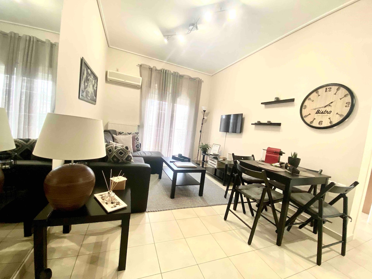 This is a new apartment, oriented to the comfort of its guests, ideal for couples and professionals. It is located in the city center, overlooking the sea and Pelion. It is just 1 minute from the beach, 3 minutes from the port pier and 2 minutes from Ermou.