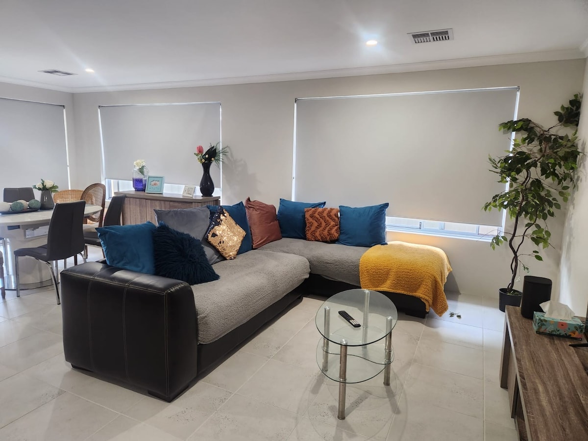 The “Pool House” is a 1-bedroom private detached unit at the rear of our property. Set in a quiet neighbourhood 10mins walk to the train station and close to Tafe, the Hospital & “The Forum”. 20mins walk to Silver Sands Beach. A 5min drive will get you to the holiday vibe at the renowned Mandurah foreshore offering boating, waterfront parks, cafes, restaurants and bars. Enjoy shared use of the pool in season. Off street parking with access to your accommodation through a secure side gate.