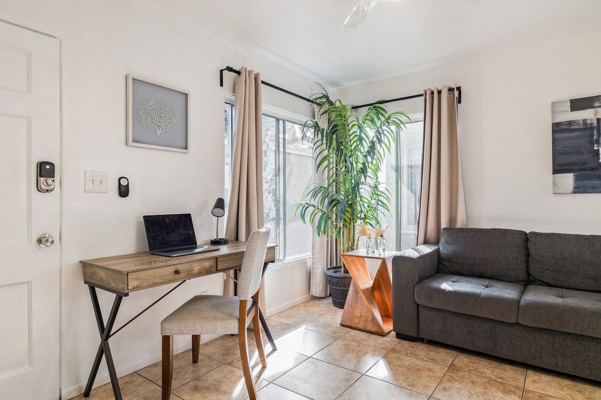Cozy 350 sqft back house in the historic downtown Encanto-Palmcroft district. Private entrance through side gate takes you around main house. Minutes from restaurants, coffee, bars, farmers market, & museums! Palm tree lined street perfect for walking. Access to our spacious backyard with BBQ. Kitchenette includes fridge, microwave, toaster, and portable cook top. We are steps away in the main house for anything you need. 10 min from Phx airport, 7 min to Roosevelt Row, PHX area, & downtown Phx