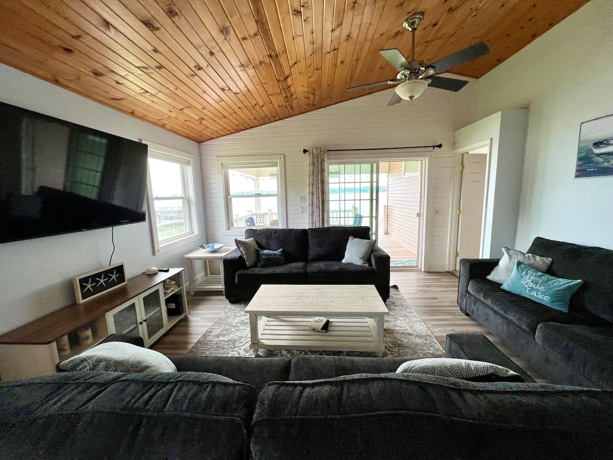 This getaway has everything your family needs to relax near the lake and more! Bring your bikes to ride 10 miles around the lake, enjoy the beach, public lake access , fire pit (wood not included), a set of bean bags or fishing! Ice cream shop and Drive-IN movie theater just minutes away! Enjoy the lake view from the living room window while sipping your morning coffee! The living room has large screen smart TV and faux fireplace heater! Canoe, Kayaking and hiking just 20 mins away!