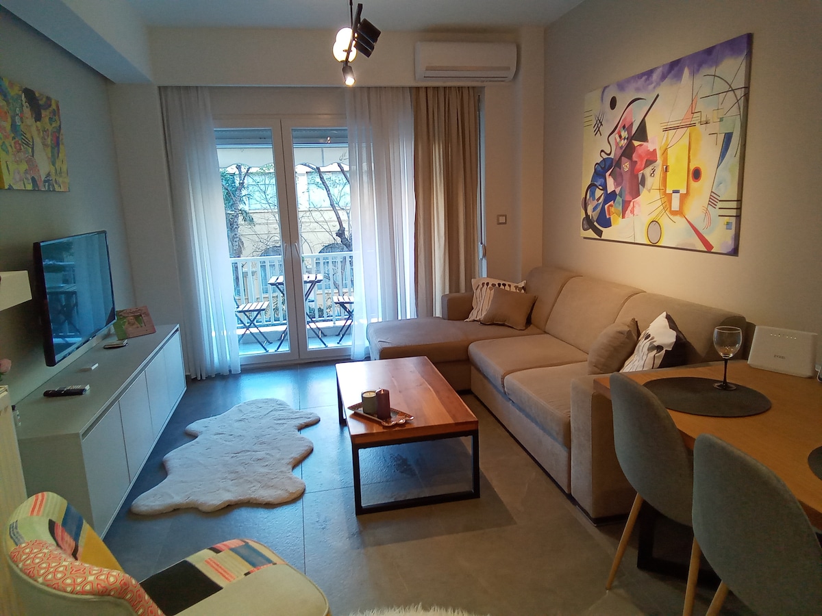 Downtown Luxury apartment in Thessaloniki's center. - Located on Iktinou's pedestrians area. - Easy walking to all venues in the heart on town - Modern Design mostly Bo Concept furniture and ample natural Lighting - High Quality mattress and pillows on queen size beds -Stylish new Bathroom +Kitchen - 3 TVS (2 smart 1 normal) -Independent gas heating - Three Inverter A/C Unit for all rooms + living room - Professionally Cleaned. - Perfect for couples/ families and friends (2 playpen/bb chair)
