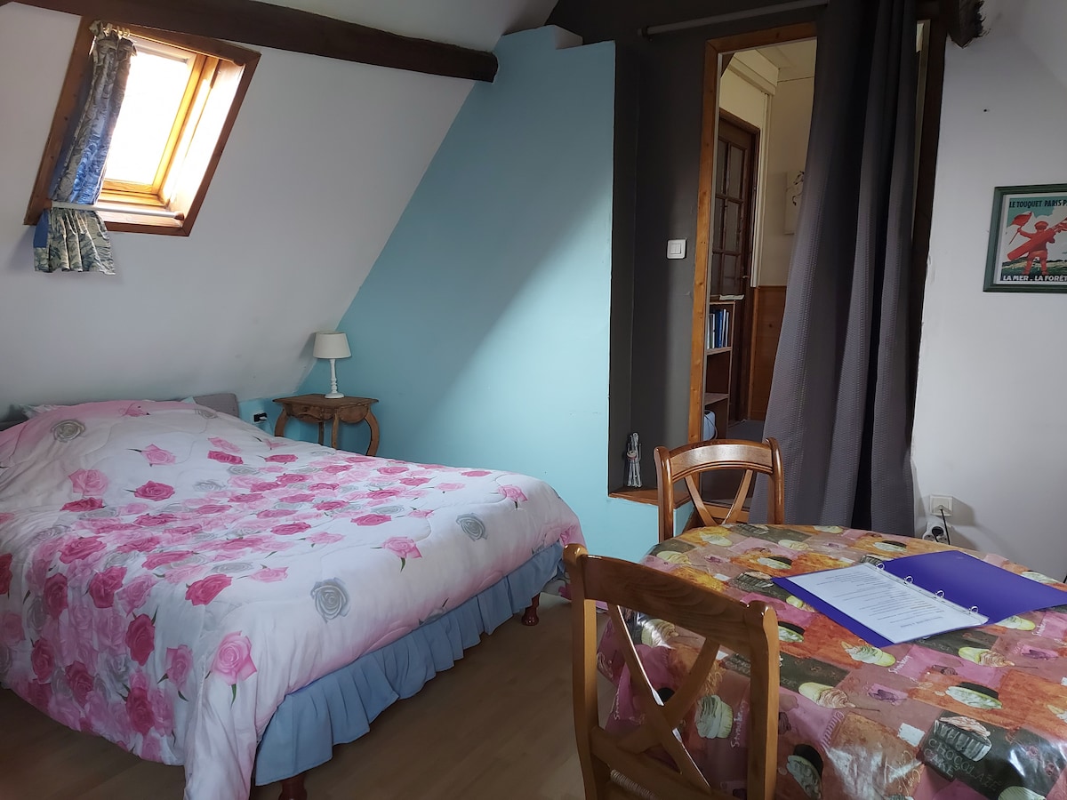 Marie Jo welcomes you to her guest rooms, located southwest of Bergues. You will appreciate the calm of our countryside and you will only be 20 km from the seaside. 2 guest rooms on one level, independent of the owners' house + 1 cottage (total capacity: 10 people). Reinette Apple Room: 1 bed 160 x 200 1 pull-out sofa bed (sleeps 2) Baby crib available upon request Toilet, sink, private shower Wi-Fi and TV Breakfast at the owner's Kitchenette available