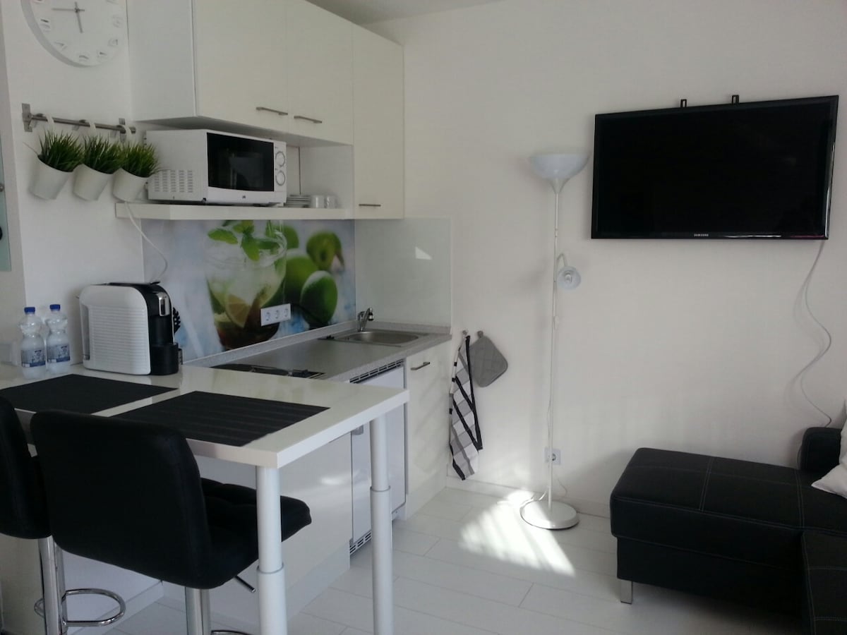 Complete, modern, stylish 48 m² 1-room apartment with workplace. Modern, comfortable sofa bed with 1.40 x 2.00 m sleeping area plus extra topper for comfortable sleeping. Centrally located in a very quiet side street. Kitchen-living room with stove, oven, microwave, coffee maker, kettle, fridge and beautiful solid wood high table with two stools. Spacious bathroom with extra large shower, sink, toilet. Equipped with hair dryer. Feel free to ask for extra requests.