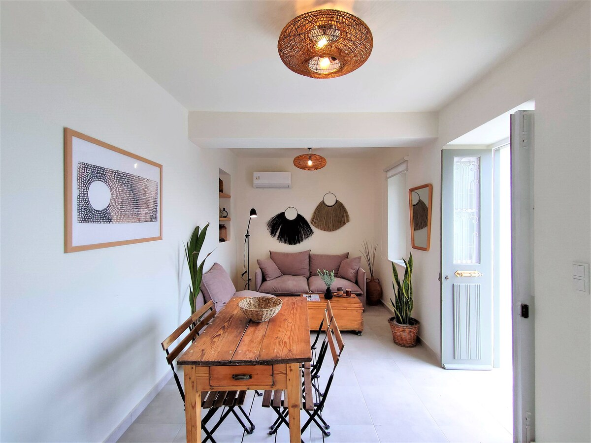 A home with comfort, close to the sea that can provide relaxing time from the daily routine for every kind of taste. Located in the heart of Chora, inside the old town. In a very central spot, a cosy and restful space, close to all the restaurants and shops of the Agora, in a quiet and narrow street. Arrive and forget all about your car, as you can find everything you need inside Chora. Restaurants, bars, cafes, museums, art galleries and beautiful beaches are just next to you.