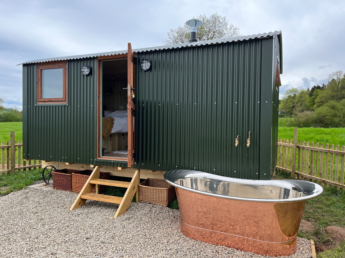 Get away from it all and relax in our beautiful shepherd’s hut, on our working farm nestled in the South Shropshire Hills, near Ludlow. Rain or shine, winter or summer, the hideaway offers the perfect experience, catering for all eventualities. Whether it’s enjoying our outside copper bath for two, cooking s’mores on the fire pit or just hunkering down in our luxurious hut with underfloor heating and a wood burner, a stay in Holly Bush Hideaway is a trip to remember.