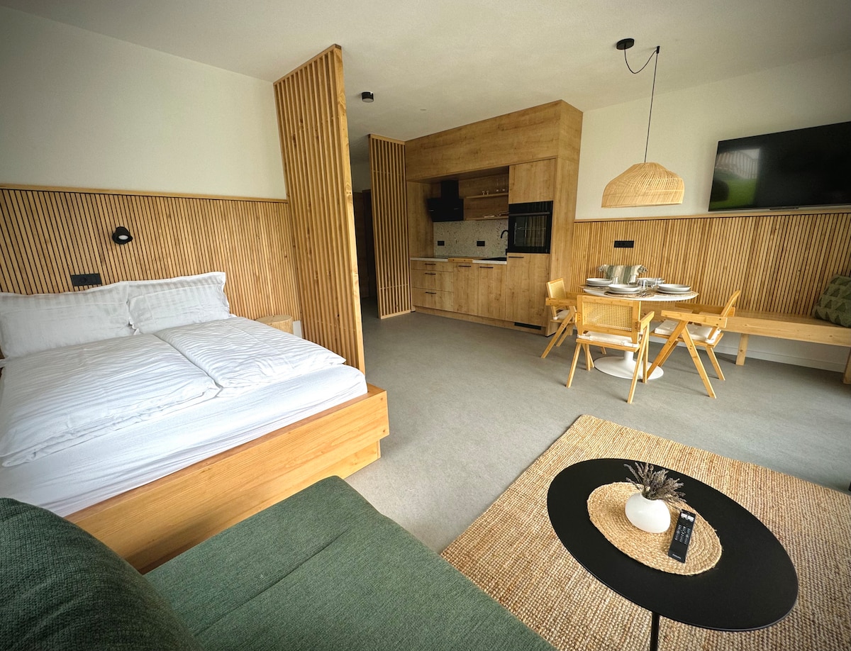 Aqua Suite Bled is your private wellness cottage with a seasonal heated pool (May–October) and a private outdoor jacuzzi available all year, offering complete privacy. Enjoy a modern, elegantly furnished apartment with stylish details, a private entrance, and a terrace. A welcome package with sparkling wine and chocolates awaits you upon arrival. Just a few minutes’ walk from Lake Bled and the town center – ideal for a romantic getaway or special occasion.