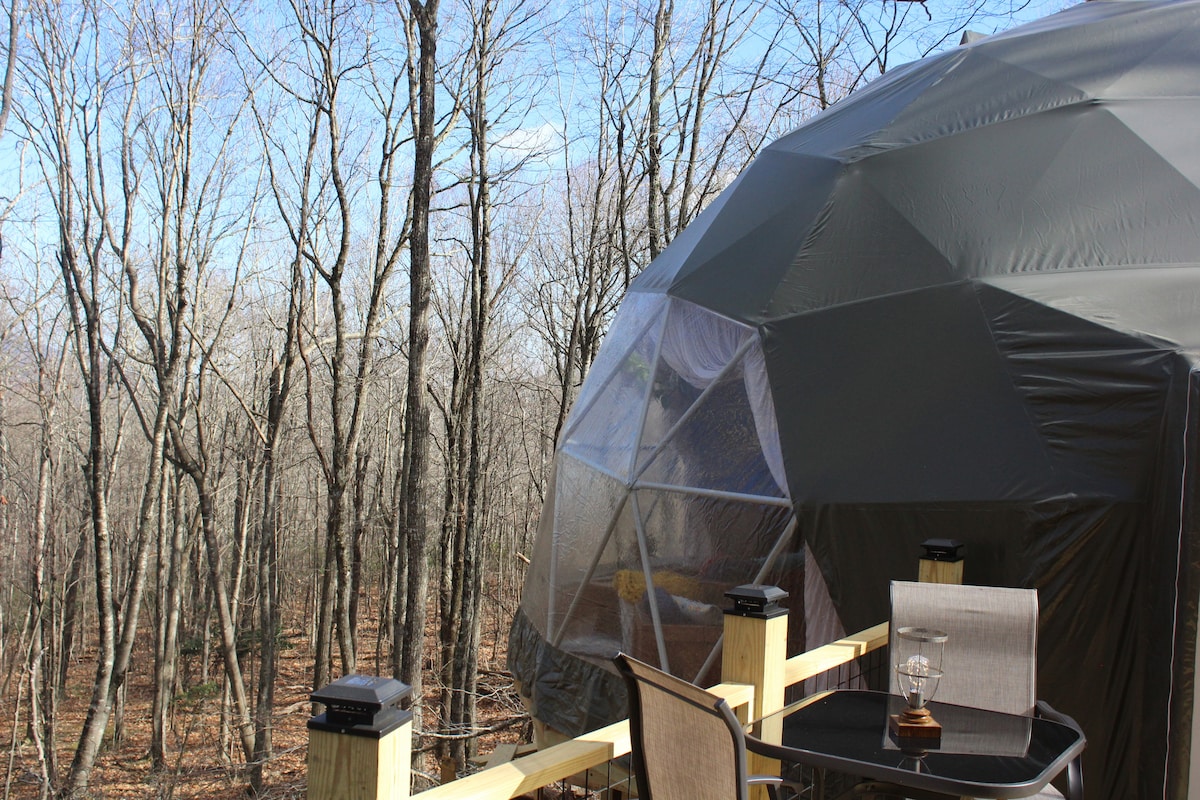 A private & eclectic Appalachian Mountain experience awaits you at 4Creeks. Well off the main road and nested in the trees, “On the Rocks” geodome is a luxury “glamping” experience! This geodesic dome has it all— full kitchen, full bath, supplemental heat & air conditioning, babbling creek and forest views. Want to go out? We're only 10 minutes from downtown. Like staying in? Our full kitchen and grill bring you comforts of home. Larger party than 4? Book our Skoolie “High Rollin” for 2 more!