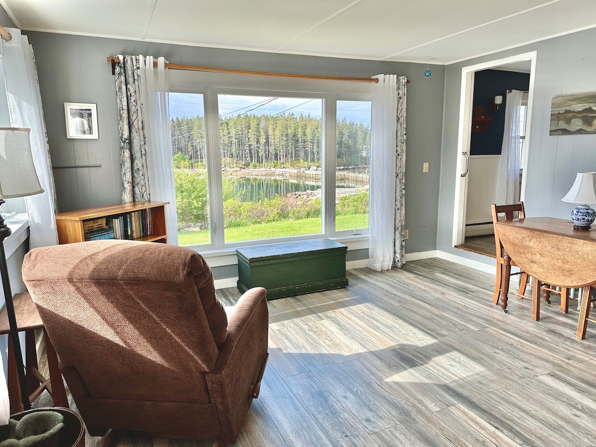 1 floor living with downstairs bedroom and bath, sleeping loft and a wrap around deck in a peaceful setting. Two can stay on the first level with no stairs, and your kids or guests can use the twin beds on the loft with there own half bath. The open kitchen and dining area is fully equipped, the living room is comfortable, and it's all bright and new. There is a trail to our own rocky beach on the cove, bring a kayak, or swim in the chilly water. A pleasant, quiet spot on Webb Cove.