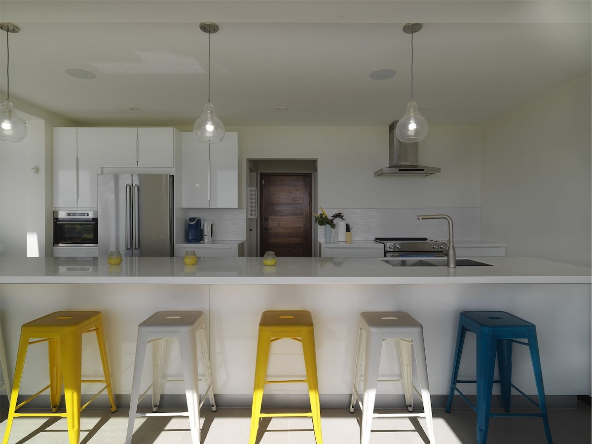A spacious, modern, beautifully decorated home with a zen vibe and an inspiring location for working away from home. ‘Roots’ has two cozy double bedrooms, comfortable work spaces and fully-equipped kitchen with kitchen island, and deluxe double fronted fridge, en-suite bathrooms and wooden floors. Lie by the infinity pool and watch as a bright blue-grey tanager flies right over your head from one tree to the next. The perfect blend of treehouse and charming, stylish Caribbean poolside villa.